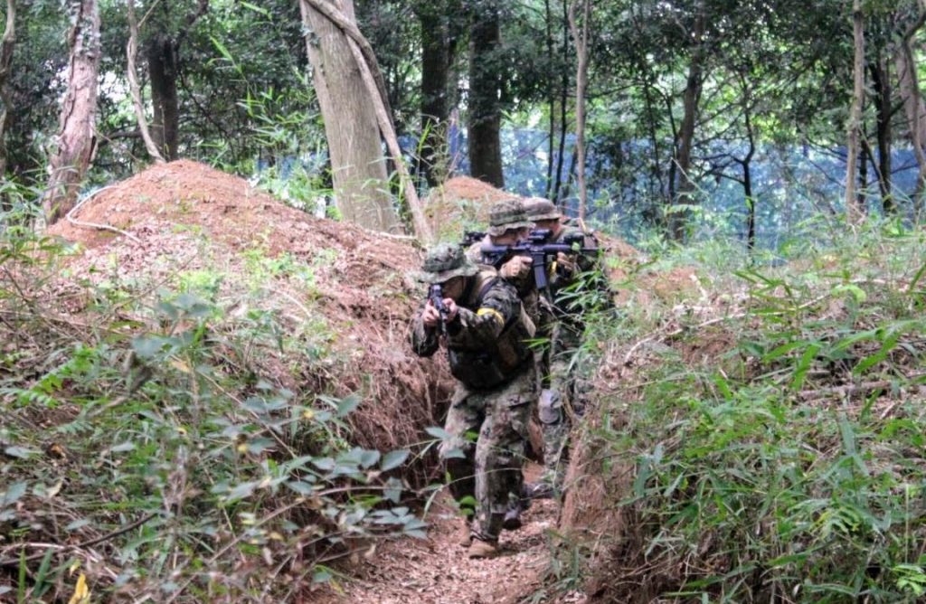 さらに小隊移動の場合、先頭が正面を索敵しつつ前進し、敵を発見次第、後方隊員にハンドシグナルで報告。縦列進軍の場合各々が死角をカバーしながら前進!」