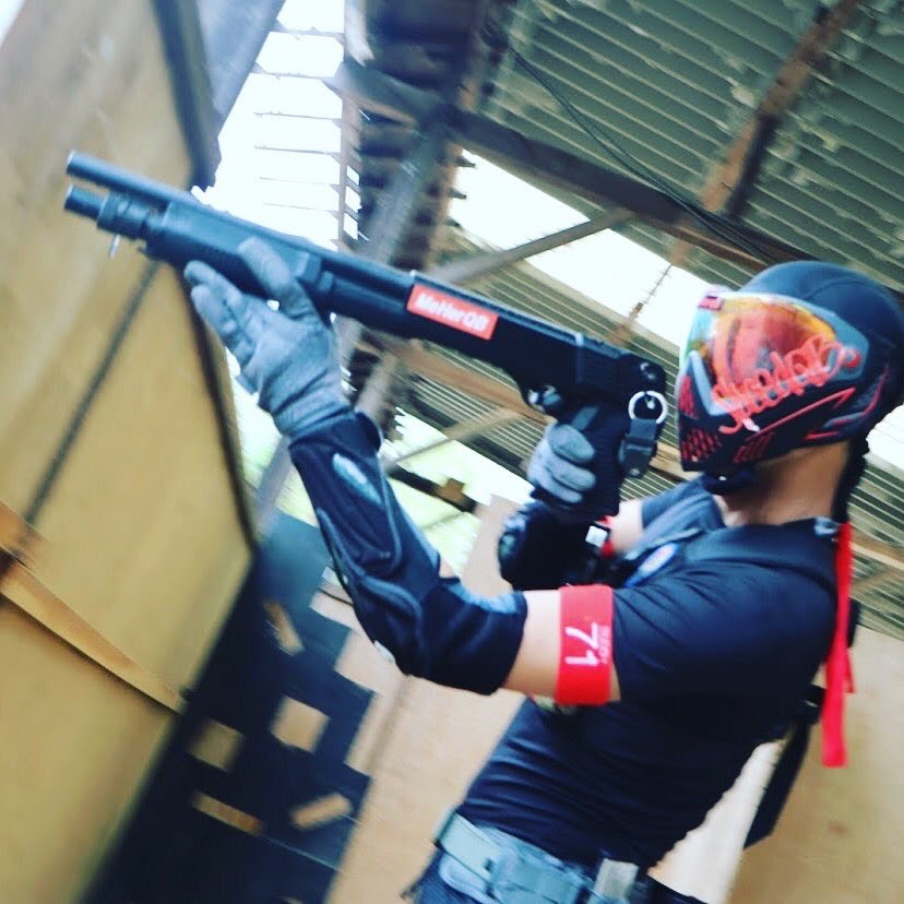 インドアフィールドでは黒を基調とした動きやすい服装の方が多いですね!たいていのフィールドが市街地をコンセプトにしているので黒の方が映えるから…でしょうか?笑