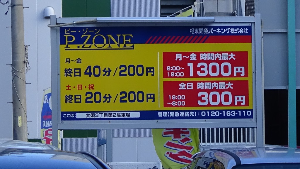 こちらの駐車場の土日最大料金は1500円! 店舗から徒歩10分圏内なら最安値です!