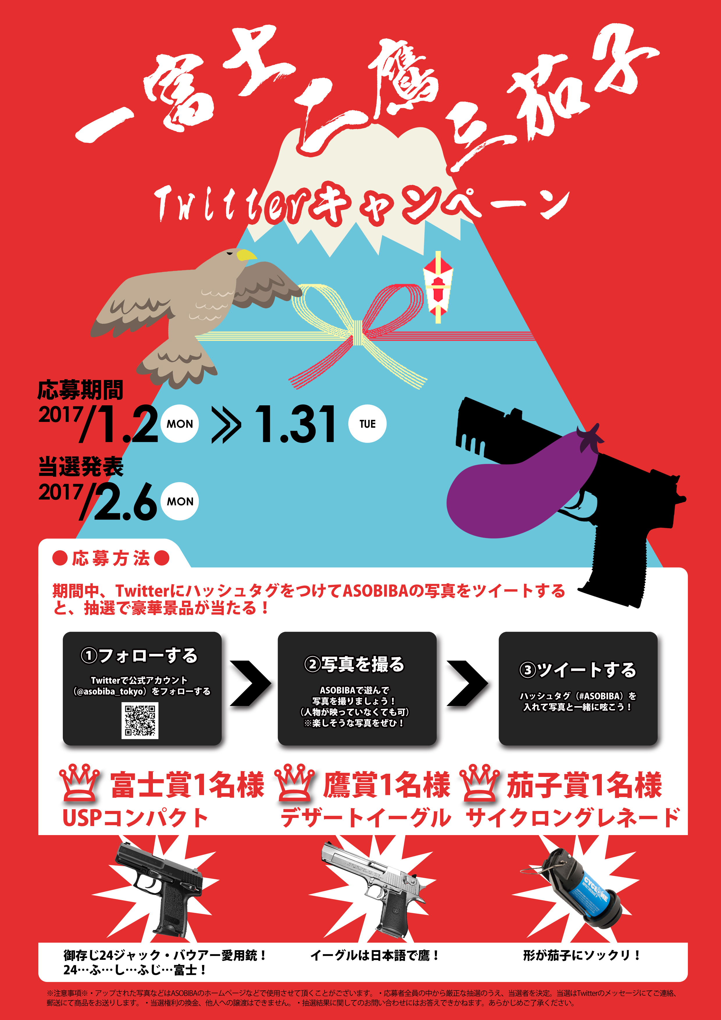 ASOBIBAに来て写真付きでつぶやくと「富士」「鷹」「なすび」が当たります(‘◇’)ゞこれはめでたい!