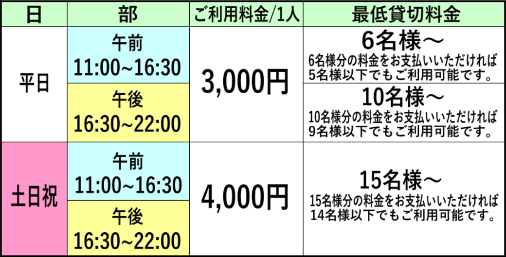 ◆平日11:00~16:00 1人あたり3000円、最低6人から
