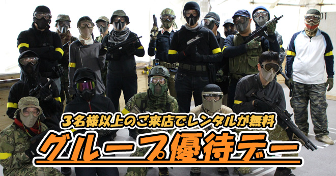 3名以上のグループでのご来店で全員レンタルが無料!さらにBB弾も支給!