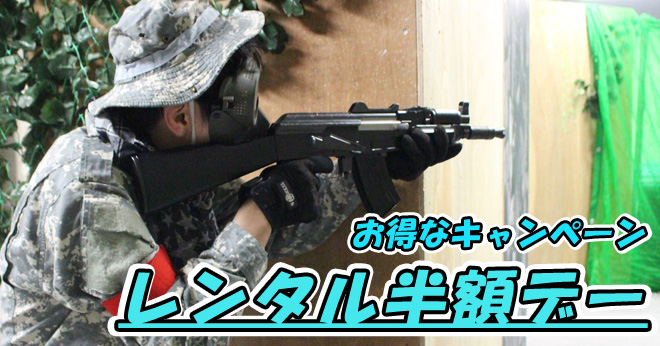 ・土日祝日レンタル 長物フルセット(ライフル、マスク、迷彩服上下、小物3点):4,000円 → 2,000円