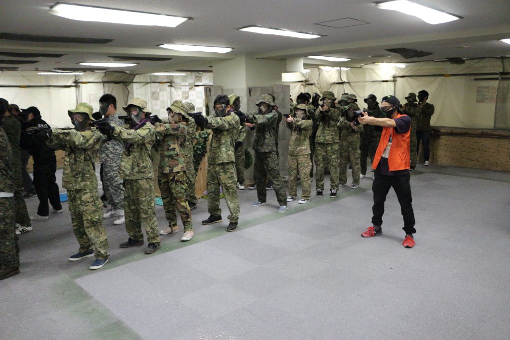 座学でルールを学んだ後には、エアガンを安全に取り扱う為際の講習が始まります。