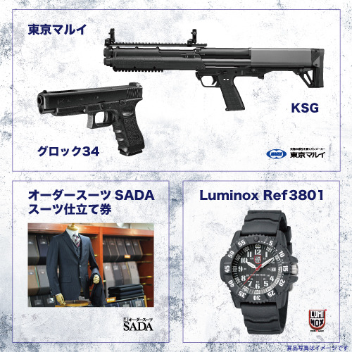 グランプリ:東京マルイ KSG、SADAスーツ仕立て券、Luminox時計
