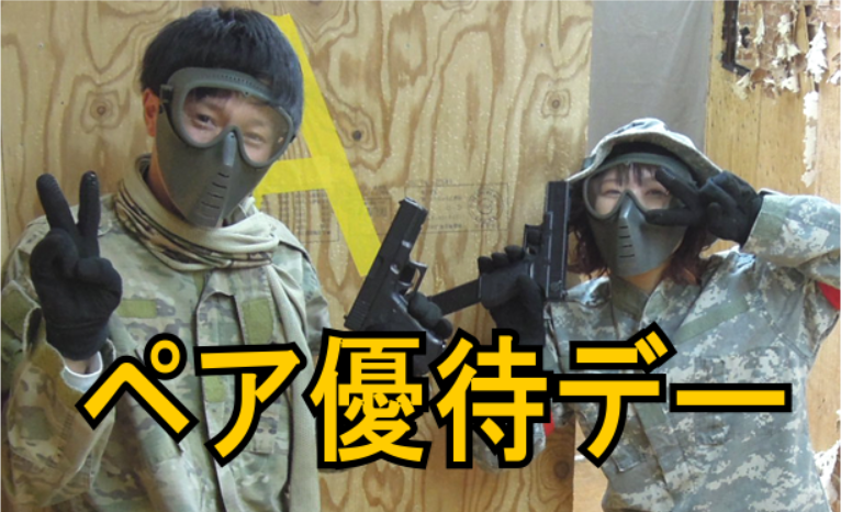 ペア優待デーなら2名様以上で参加すると、2名様のどちらも『参加費500円OFF』か、銃・マスク・グローブの『レンタル無料』からお好きな方を選んでご利用いただけます!