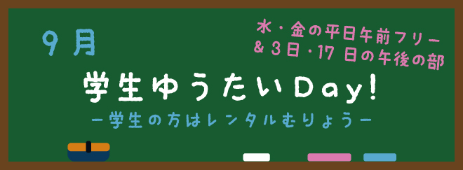9月の水曜・金曜の午前フリー&3日・17日の午後は学生レンタル無料‼
