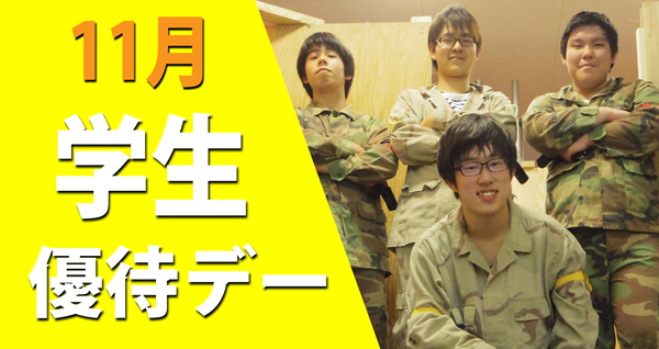 当店では、11月に学生の皆さんがお得にサバゲーが出来る「学生優待デー」を実施します!