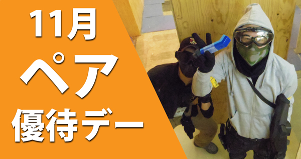 ペア優待デーなら2名様以上で参加すると、2名様のどちらも『参加費500円OFF』か、『銃・マスク・グローブのレンタルが無料』からお好きな方を選んでご利用いただけます!