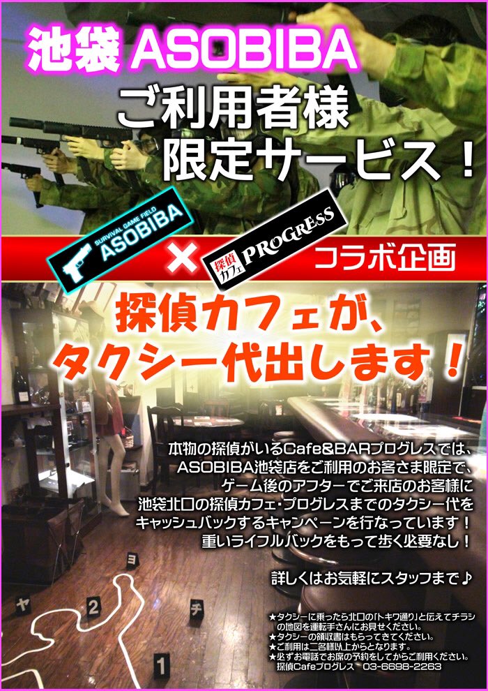 ASOBIBAでのゲーム後に探偵カフェ・プログレス様に飲みに行けばタクシー代をキャッシュバック!