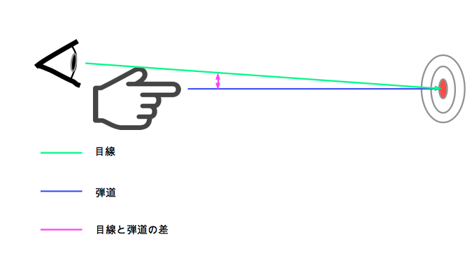 残念ながらこの差はどうにもなりませんので、距離によってどの程度の差があるのか=相手との距離によって、どこにサイトを合わせればいいのかを覚えるしかありません。
