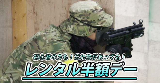 ・レンタル フルセット(ハンドガン、マスク、迷彩服上下、小物3点):2,500円 → 1,250円
