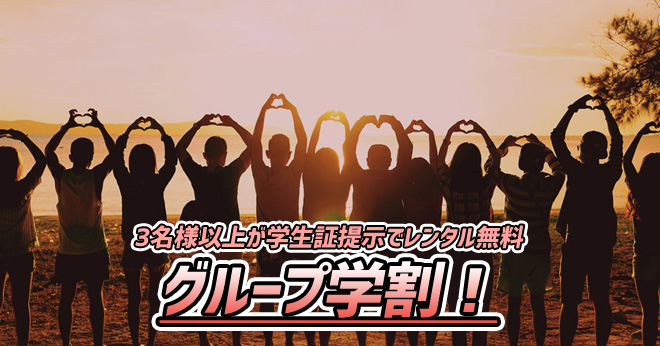 3名様以上でご来店の方全員が学生証のご提示でレンタル料金無料