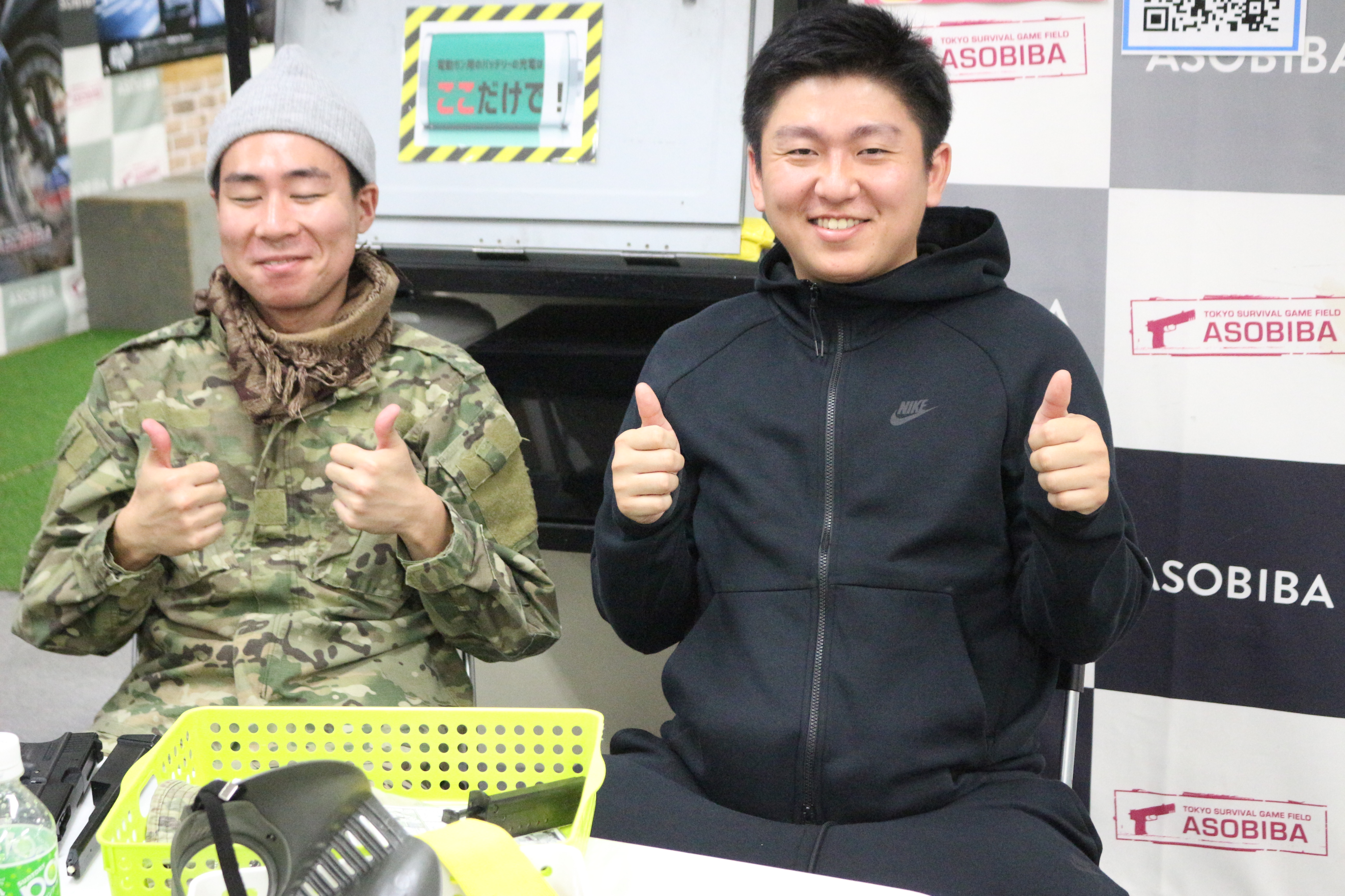 「仕事の関係で昼間に遊べないのでネットで”深夜 遊べるスポット”みたいな感じで検索したらASOBIBAが出てきて、ちょうどサバゲーに興味もあったしやってみるか!!となって2人で来ちゃった///」