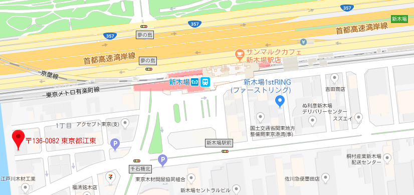 赤いチェックマークの場所に新木場フィールドはあります!周りは運河で囲まれており、倉庫や工場があるため独特な雰囲気があります。