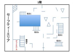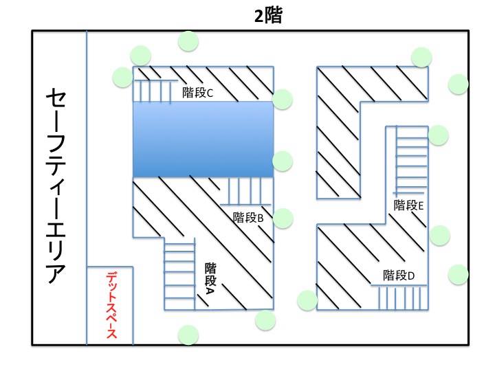 中は1階に受付、お手洗いがあり、2階へ続く階段を上ると突き当たりにセーフティ、右側に喫煙所とフィールドの出入り口があります。
