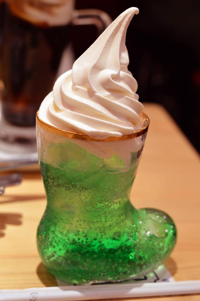 こちらクリームソーダです。子供の時飲んだメロンソーダは、丸いタイプのバニラアイスだったんですけど、