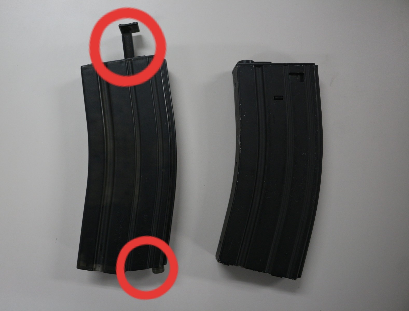 持ってみると重さなどが違いますが、パッと見た感じでは◯で囲った部分が見極めポイントです!