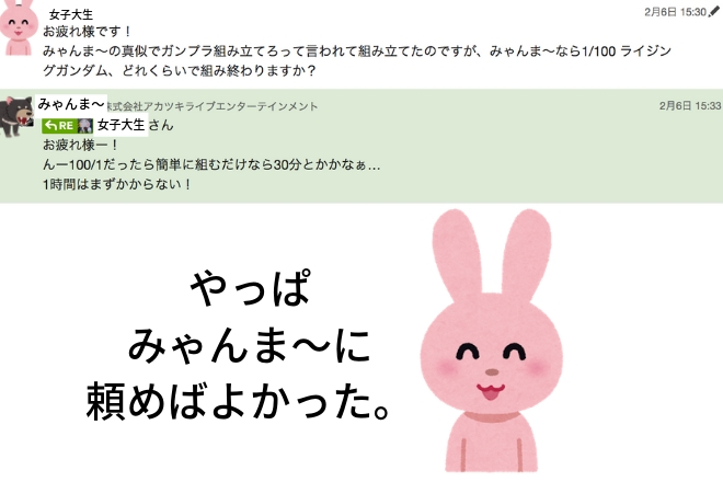 みゃんま〜の真似でガンプラを作ったので、実際どれくらいで出来上がるのか聞いてみました。