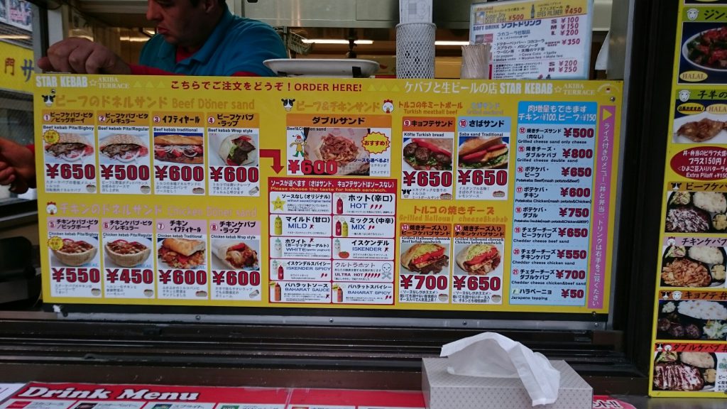 道順はアキバ店右に出て、次の角で左にずーーーっとまっすぐいったところにある「モーゼスさんのケバブ」屋さんで、ケバブライスのミックスを2つ買います。