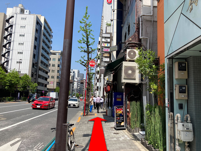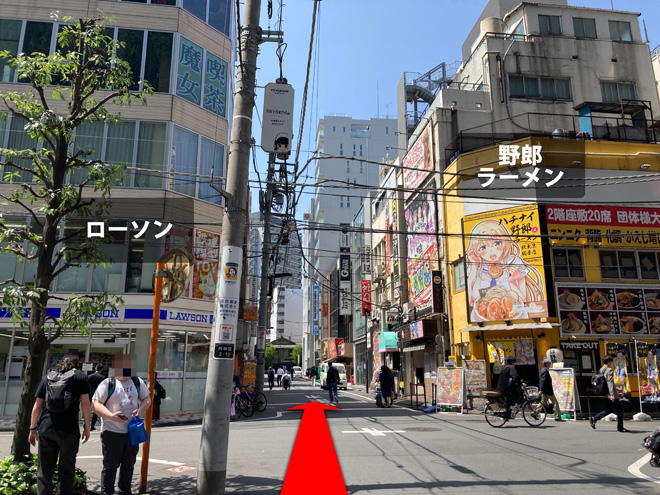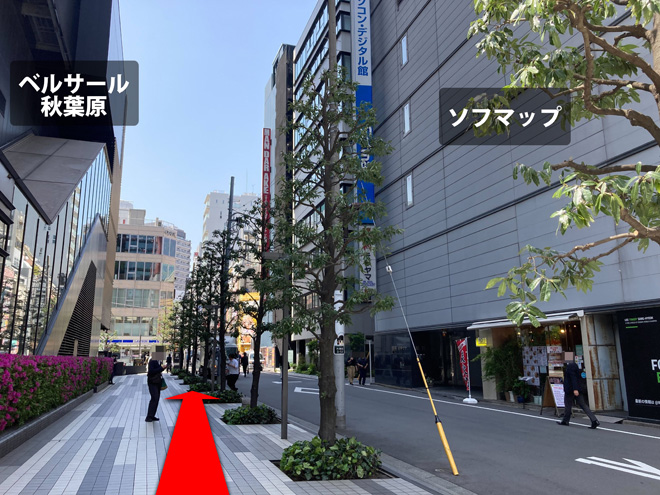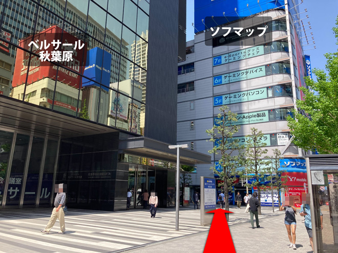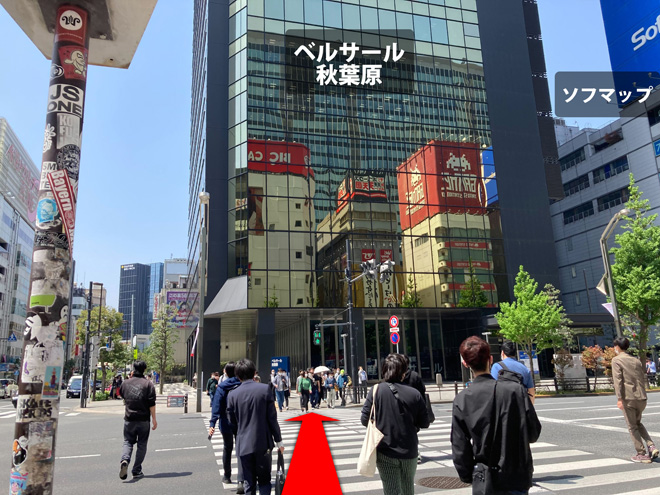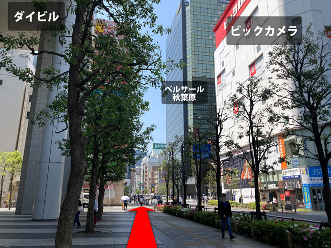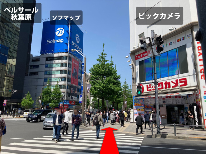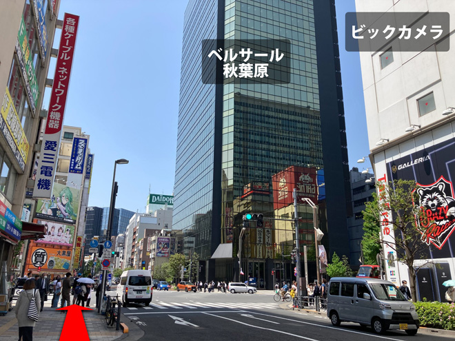 そのままビックカメラを右に見ながら、通り沿いにベルサール秋葉原のある交差点へ進みましょう。