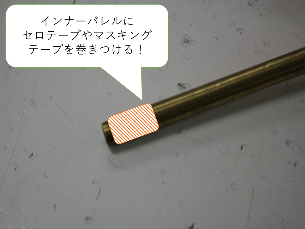 インナーバレルの先端にテープを巻きつけてこの隙間を埋めることで、BB弾の発射の際に発生してしまうインナーバレルの振動ブレを抑え、弾道の精度を向上させることができます!!