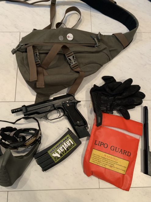 この小さいショルダーバックに必要最低限な銃本体、マガジン、バッテリー、ゴーグル&マスク、グローブを詰め込んで仕事終わりに気軽に行けます。これで電車移動がメインのサバゲーマーでも楽ちんです(´艸`*)