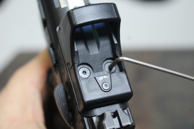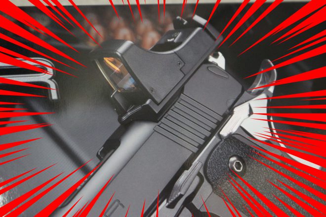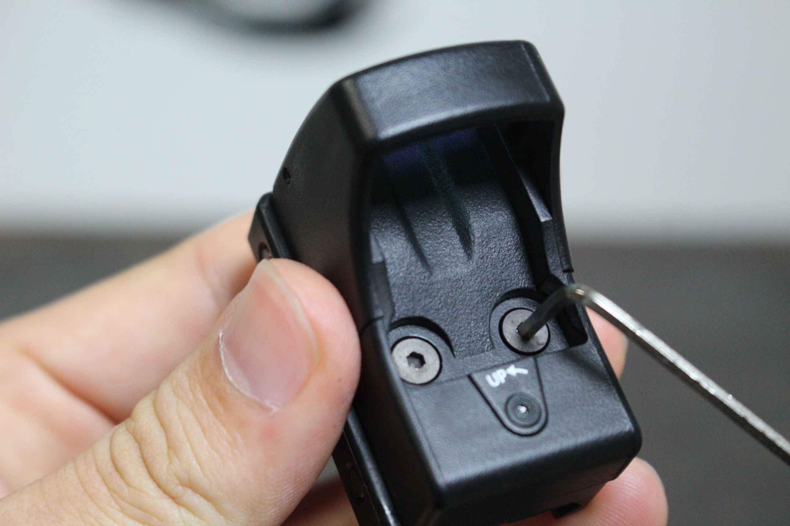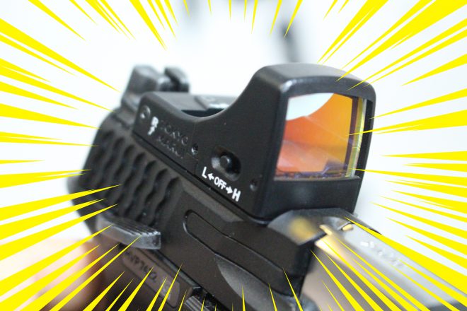 この光る点に弾が飛んでいくように、銃のホップアップ、ドットの左右上下を調整してあげると、瞬時に狙いを付けて撃つ事が出来るようになります(‘ω’)ノ
