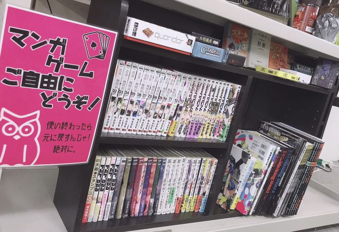 人数が少ないときやちょっと休憩したい時、1部と2部の間に空いた時間のために様々なゲームや漫画がそろえてあります。ご自由にお使いください!