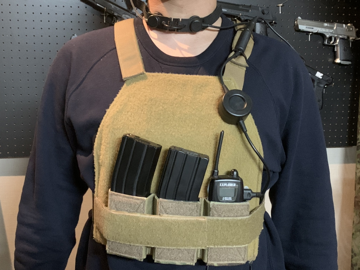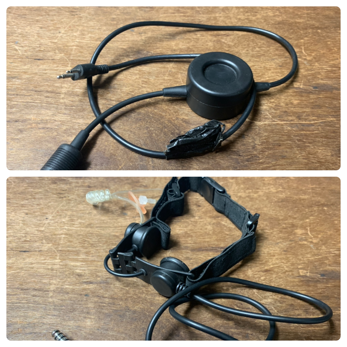 お次は、実戦投入する前準備です!普通にトランシーバー単体で使うと受信した音声が本体のスピーカーから駄々もれになっちゃうので、イヤホンマイクを使用をお勧めします。本体購入すれば一緒についてきますが、それだと見た目が・・・。という方はヘッドセットやスロートマイクなどを使うと、よりミリタリー感が出てきます。