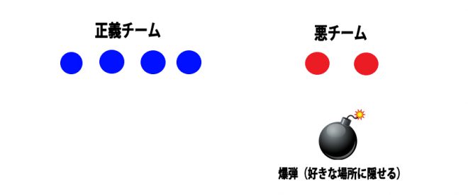 ①悪チームが先にフィールド内に爆弾を置き、自分たちもフィールド内に潜む。