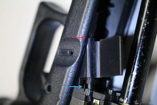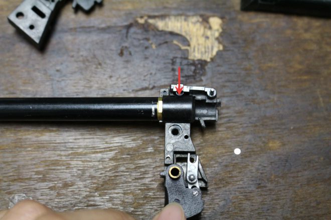 銃を逆さまにして外すと赤丸の部品が落ちなくて済みます!(何気大切な物なので無くさない様に注意)