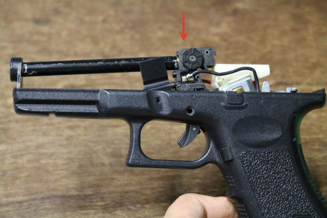 今回の銃の場合は赤丸を押しながらスライドを上にあげると外す事ができます!