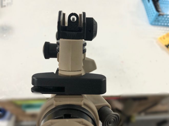 このように手前の小さい穴を覗いて奥のフロントサイトを使用するのですが、これがなんともメンドくさい!!