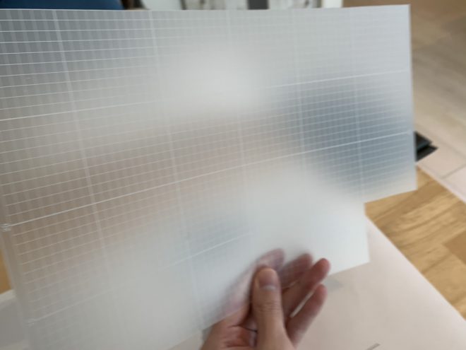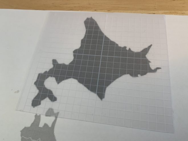 日本地図を重ねてなぞったプラ板をハサミで切り抜いたものを使います。
