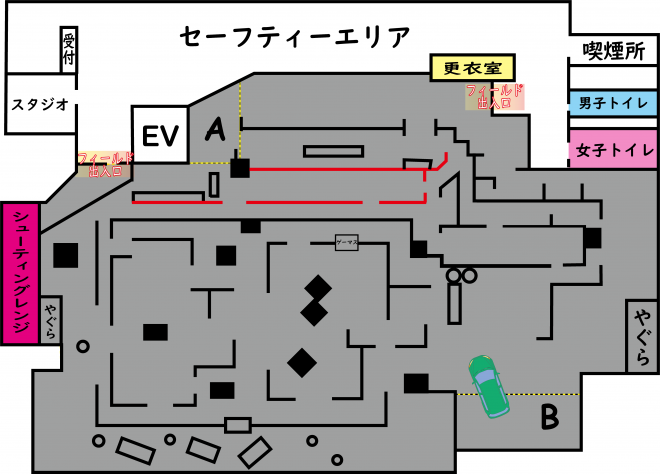 今のレイアウトで特徴的な部分といえば、真ん中に大きな壁ができてエリアが分割されたこと、片方のエリアにCQB(近接戦闘)エリアができたことです。