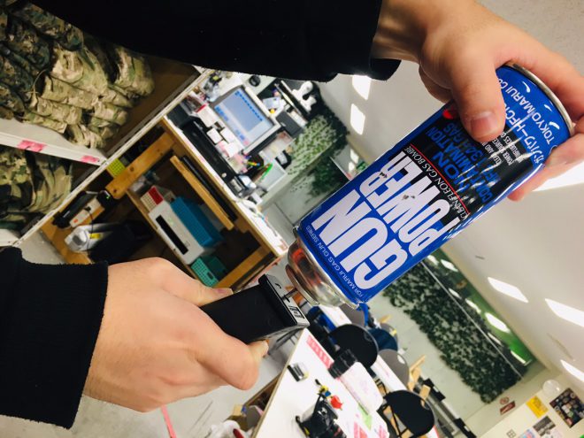 フロンガスを入れたマガジンは人肌くらいの温度に温めて、内部の液体ガスを気化させないと速い弾は撃てません!