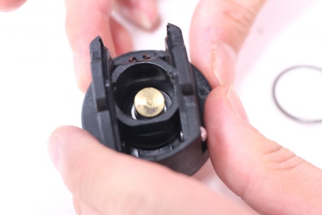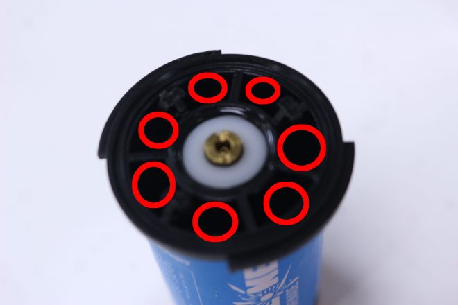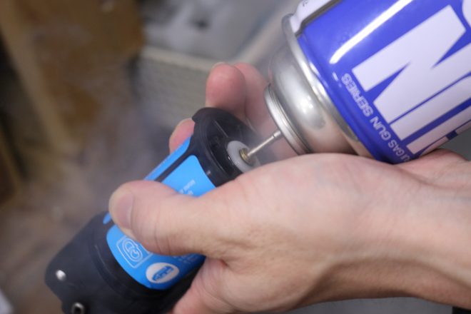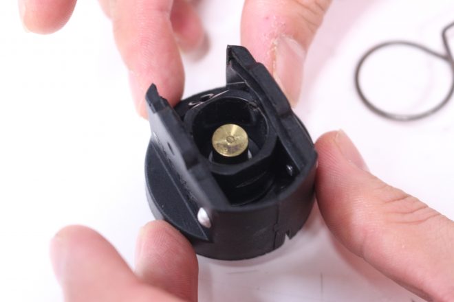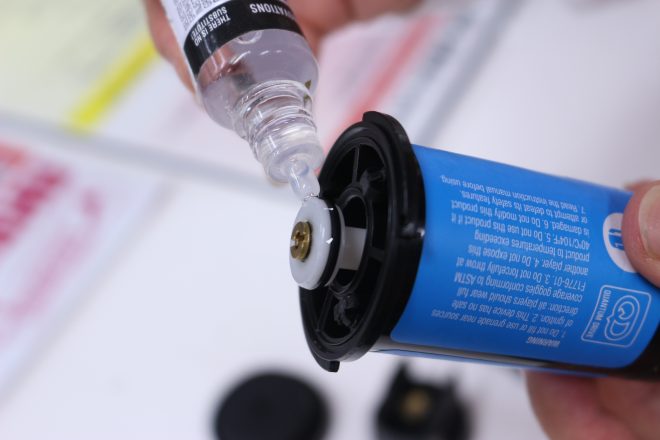 ガスの注入口がこんな感じで飛び出てるのを確認して、リング周りが乾いているようだったら付属のオイルを塗ってあげます。
