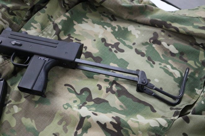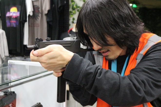 また、こちらの銃はガスブローバック式なので、撃ったときに実銃の動きが再現されていて、フルオートでの射撃も可能です。