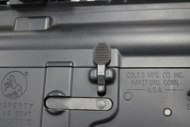 なのでマガジンを変えた後、AKシリーズならボルトハンドルを引く、M4/SCARシリーズなら写真のボタンを押せば、給弾されてロックが解除されます!