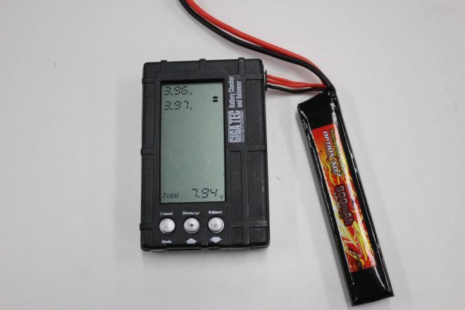 使用しているバッテリーがLipoバッテリーだった場合には、画像みたいに残量の確認、ニッケル水素の場合には、そのまま予備のバッテリーを挿すか一度充電しなおして銃につけて動作チェックをしよう!!