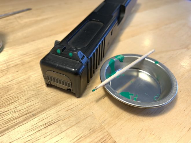 混ぜた棒についた塗料を爪楊枝の先で凹みにチョンチョンと・・・