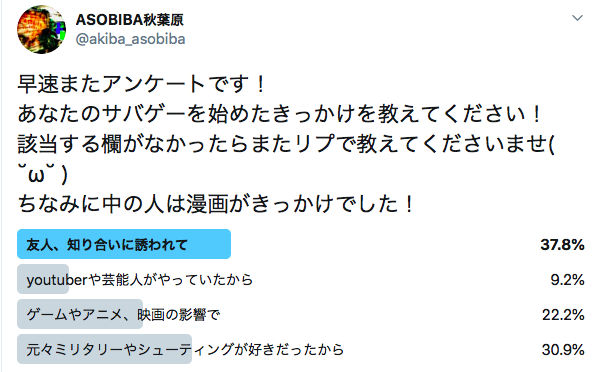 さらに好きな芸能人がやっていたり、好きな作品から影響を受けたりして、自発的にサバゲーを始めた方が3割いることも注目すべきポイントです。