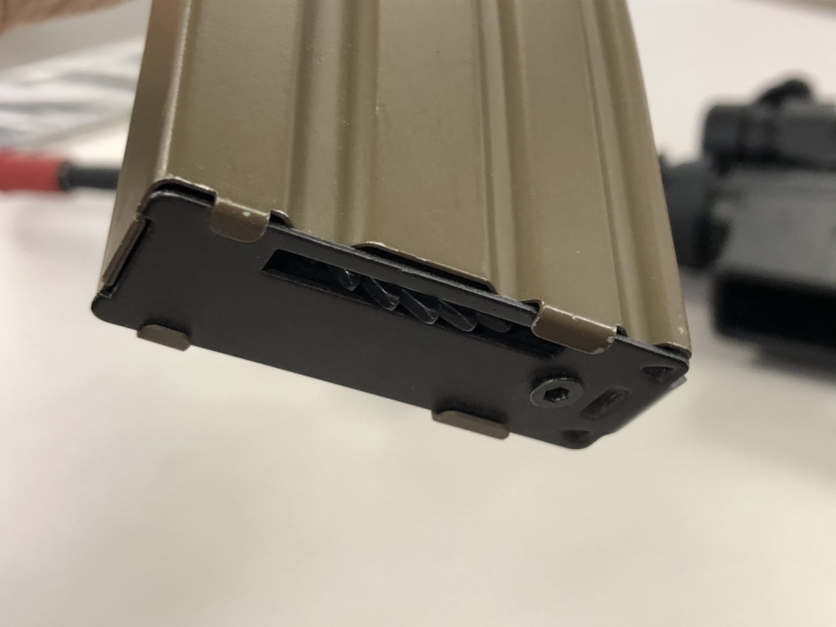 スプリング式ではない多弾数マガジンは、マガジンに充分な弾が入っている状態で底部のゼンマイをしっかり巻いてあげないと弾が銃に送られません。