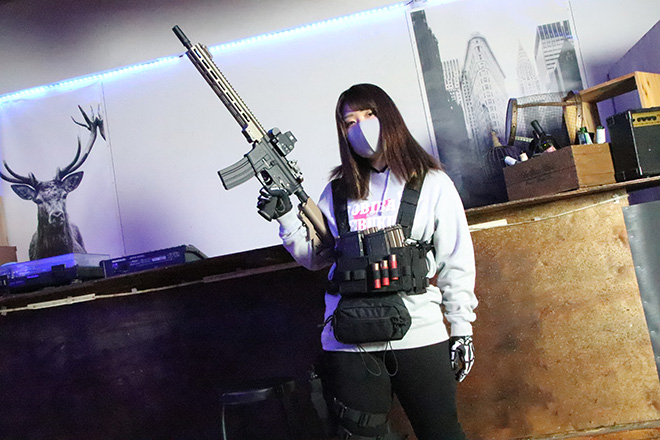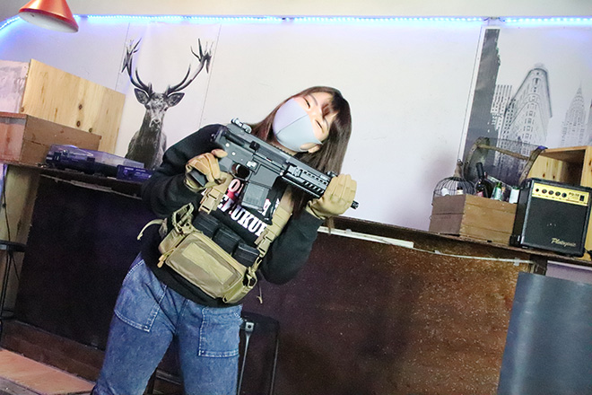 こちらは池袋店のオリジナルパーカーにM4パトリオットとD3CRMタイプのチェストリグを組み合わせてインドアでも戦いやすい軽量装備!