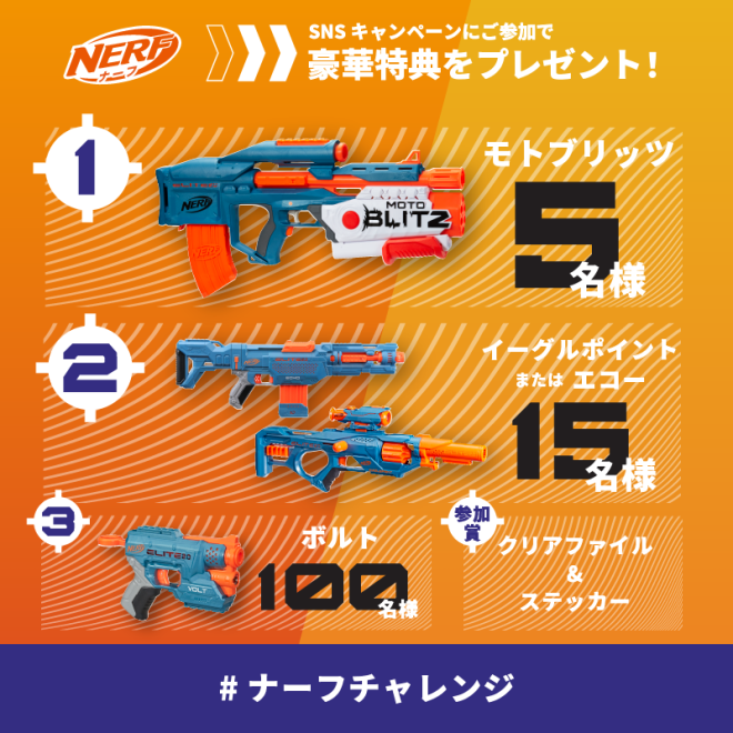 イベントにご参加くださり、SNSに「#ナーフチャレンジ」を付けて投稿してくださった方は、その場でもれなくナーフのブラスターがもらえる抽選会にご参加いただけます。