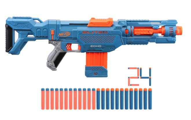 『エコー』は、着脱可能なストックとバレルエクステンションが標準付属されており、ゲームのミッションや戦略にあわせて自分なりにカスタマイズが楽しめるブラスターです。また単射に加え、トリガーを引いたままスライドを前後させ続けると10連射まで可能。長距離狙い撃ち×連射で遠くのターゲットも一撃できるアイテムです。