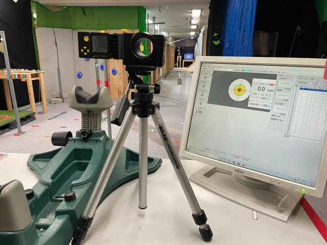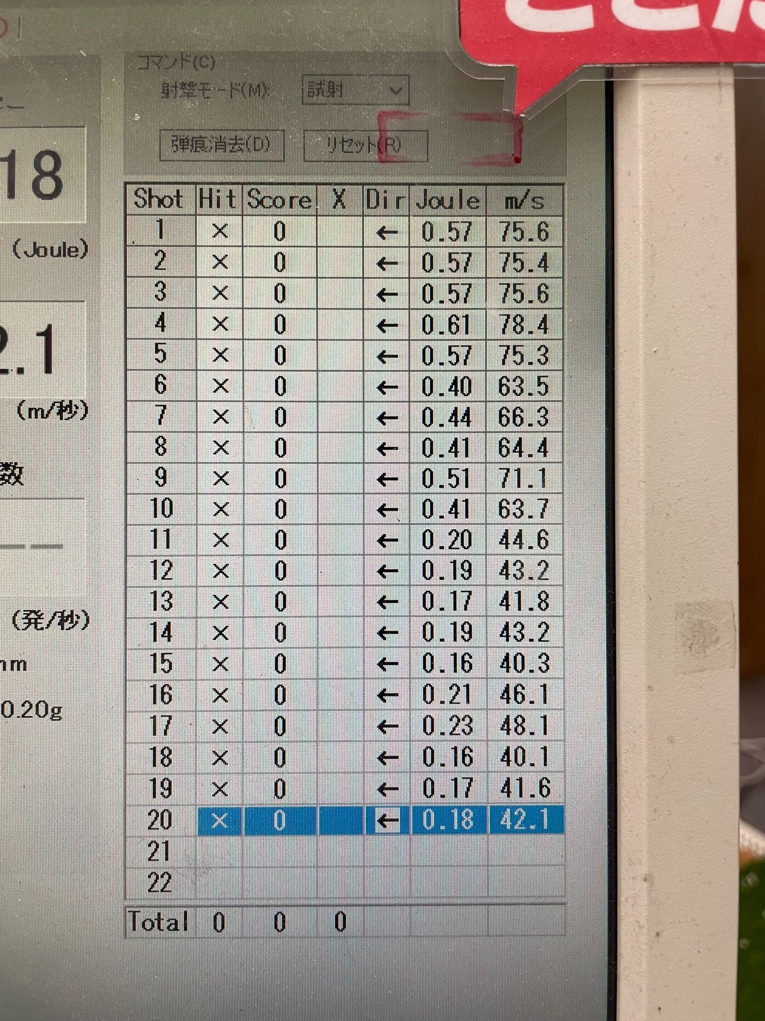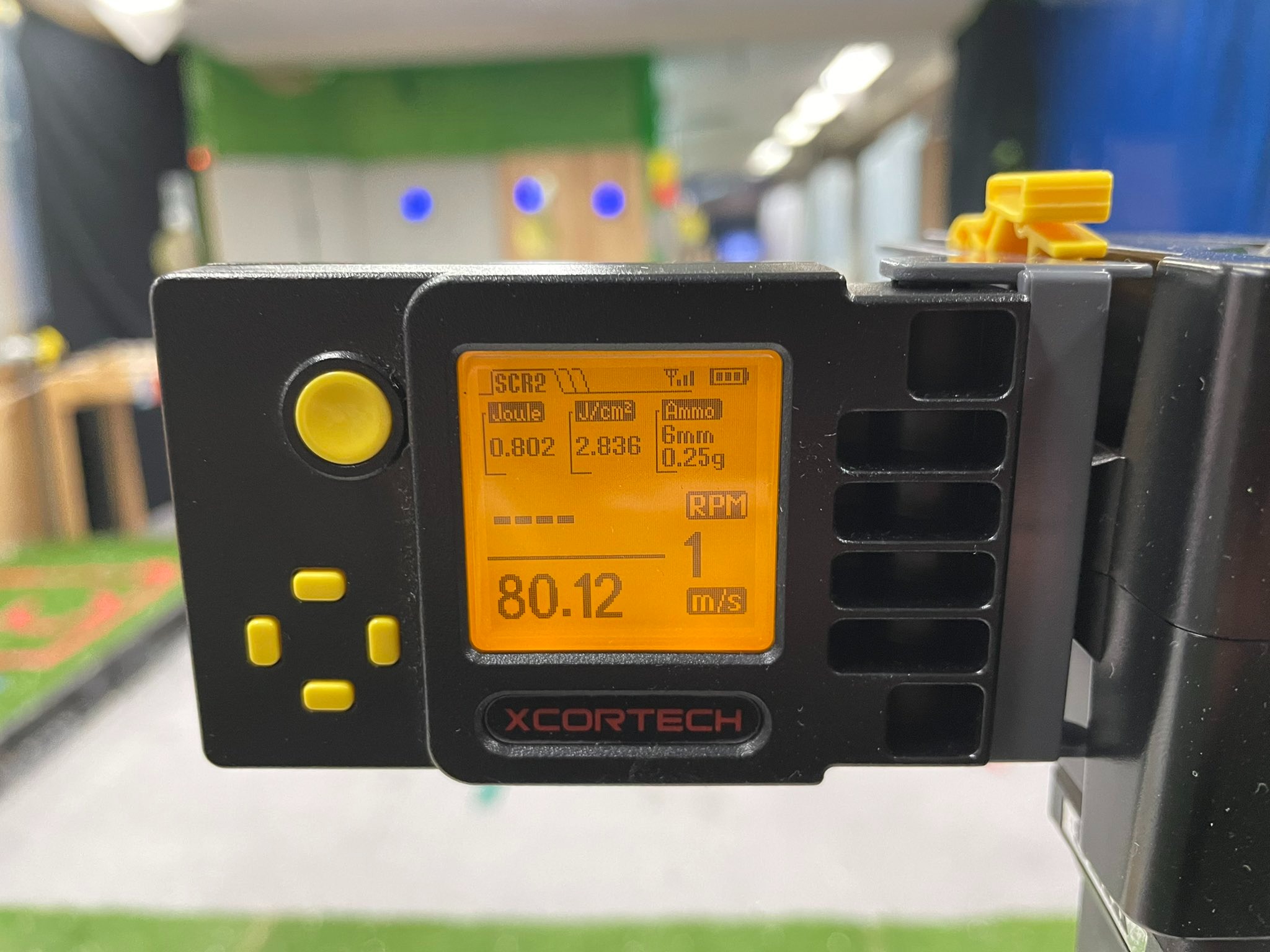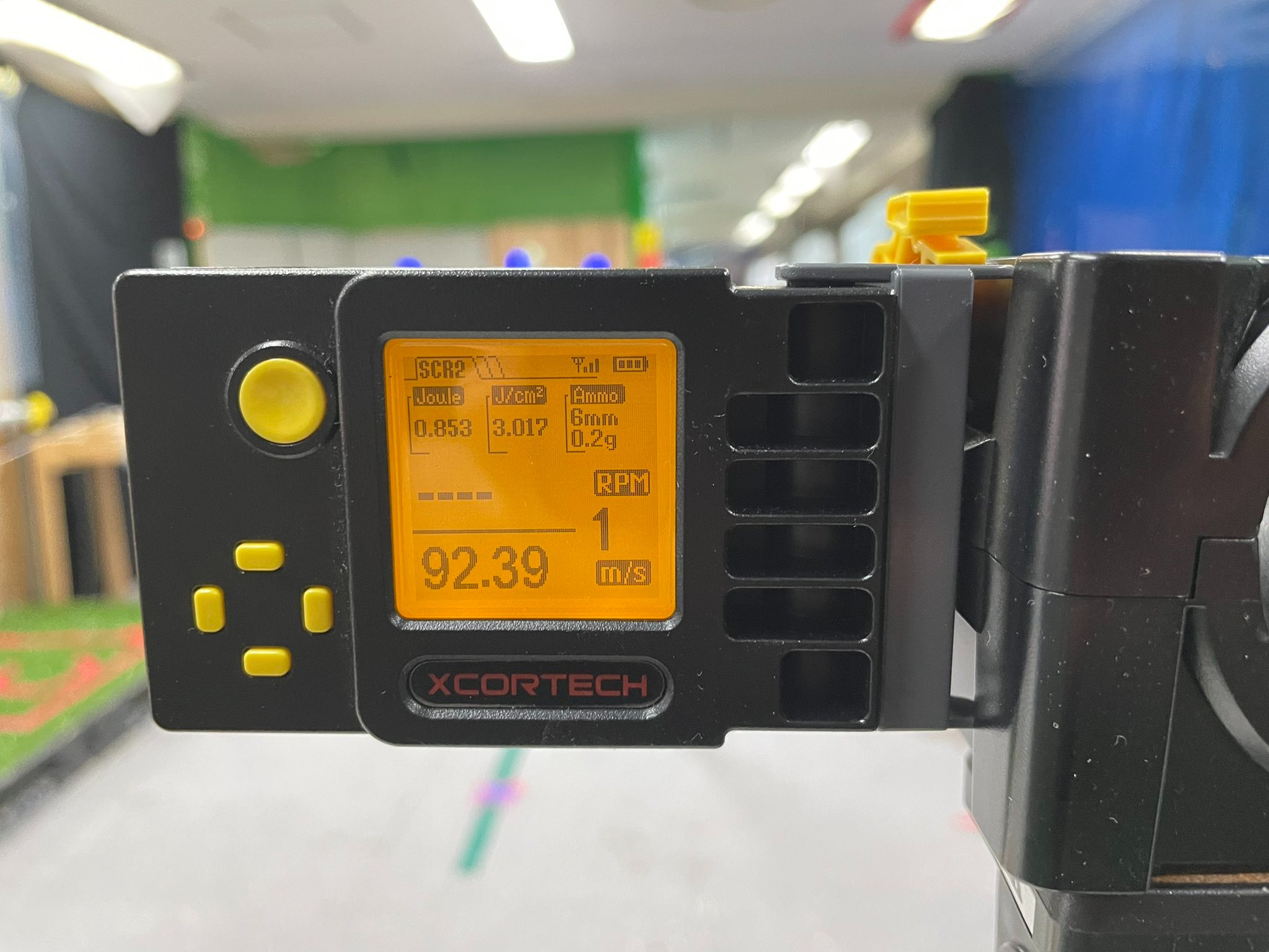 計測に使う弾速計は家庭用としてもポピュラーなXCORTECH X3500、ターゲットはEitechのStealth-Target ST32。PCのモニタ(レンジ奥にちっこく見えるヤツ)に防弾性のあるセンサーを設置し、連動してもう一つのモニタに着弾点と着弾時の弾速・ジュールを表示してくれる優れものです。