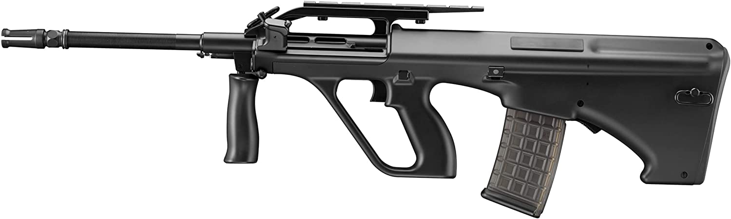 ステア―社のAUGですね!ゲーム中では、レシーバーを交換する事で、サブマシンガンにも、ライトマシンガンにもなる、意外にバリエーションの広い銃です!今作は、そういう銃がとても多いです。電動ガンのAUGはトリガーロックを解除する手間が唯一の欠点だと個人的には思っていました。ただ、PERUNや不知火商店の電子トリガーを導入できれば、欠点をほぼ消すことができます!組み込み難易度はとても高いので、ショップさんにお願いしてね!