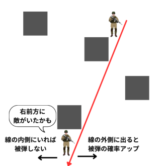 味方が前に出て前線を上げているので、こんなに張り付かなくても横から撃たれる確率は低いです。